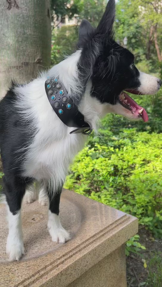Genuine Leather Dog Collar Vintage Green Gem Studs Handmade Heavy Duty Anti-Pull Collar